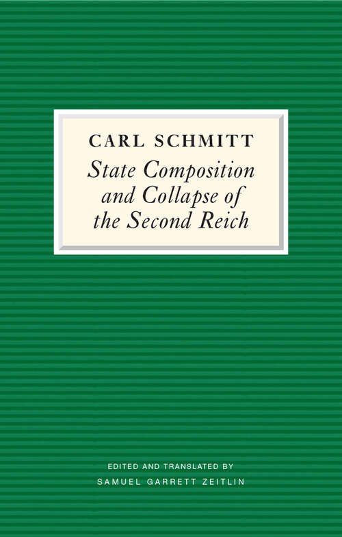 Newly published for the first time in English translation, Carl Schmitt’s 1934 tract, State Composition and Collapse of the Second Reich: The Victory of the Bourgeois Citizen over the Soldier, is an important addition to the corpus of Schmitt’s work in… English. Written and published at the height of Carl Schmitt's entanglement with National Socialism, this work outlines Schmitt’s historical and propagandistic account of the collapse of the Second German Empire and of Germany’s defeat in the First World War and sets the stage for his account of what should come next. In this swiftly paced polemical history, Schmitt locates the roots of Germany’s defeat in the First World War in constitutional compromises between the Prussian soldier state and the liberal bourgeois citizenry forged in the course of the nineteenth century. These compromises left unresolved the tension between liberal constitutionalism and an executive-led strong state built on military power, preventing the Reich from being able to mobilize German society in order to wage a successful war effort. Schmitt’s account of how the Bismarckian Reich was undermined from within serves as a guide, in his view, for how the Nazi regime should avoid a similar fate. A work of crisply riveting and, at times, haunting prose, Schmitt’s State Composition and Collapse of the Second Reich will be a source of persistent historical interest to all students of history, politics, Nazism, political thought and the First and Second World Wars.